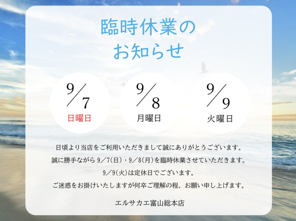 誠に勝手ながら9/7(日)・9/8(月)を臨時休業させていただきます。