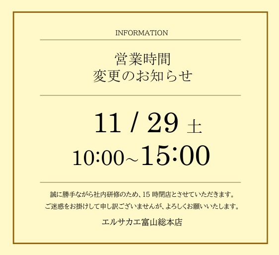誠に勝手ながら社内研修のため、11/29(土)は15時までの