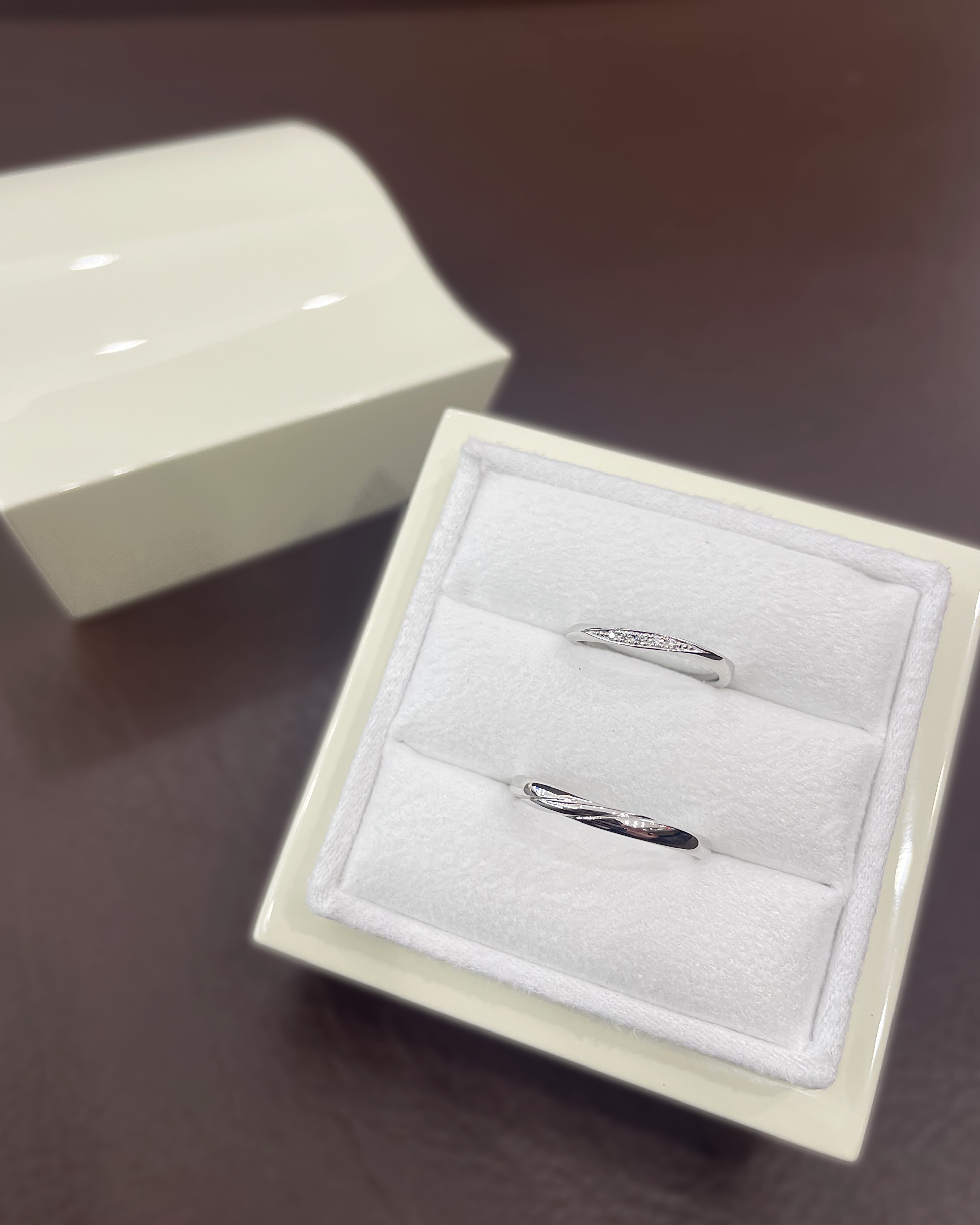 寄せては返すさざ波の心地良いリズムをゆるやかな斜めのラインで表現した結婚指輪。