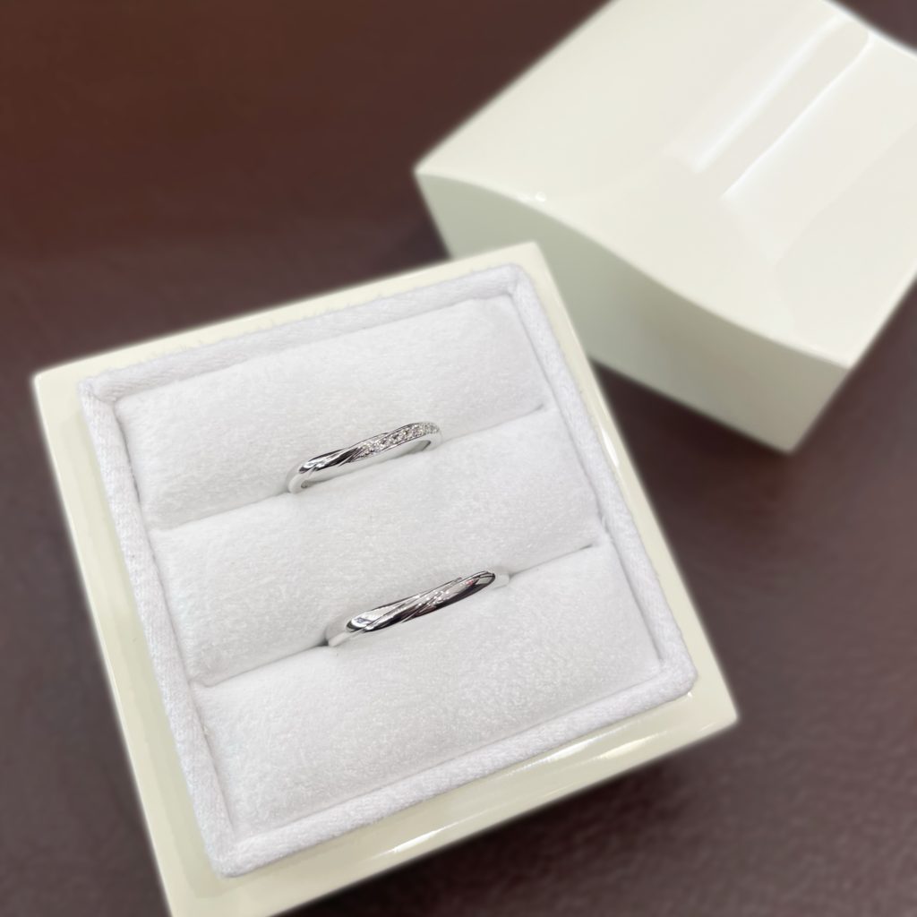 寄せては返すさざ波の心地良いリズムをゆるやかな斜めのラインで表現した結婚指輪。